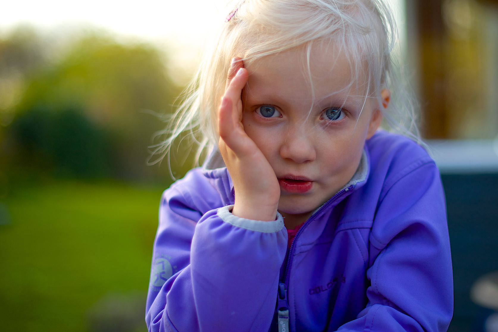 Det är ett impulsivt porträtt av en avslappnad liten flicka. Fotografen har utnyttjat det korta skärpedjupet för att framhäva huvudmotivet.